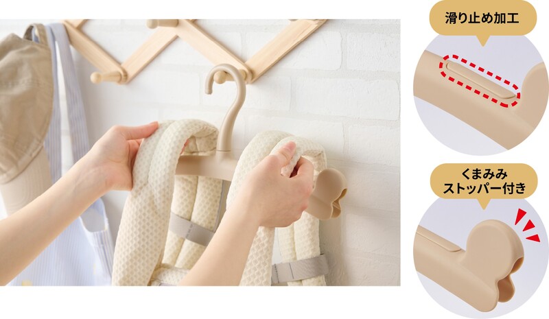 肩ひもをかける部分は滑り止め加工、両端にはストッパー付きで、肩ひもがずるずる落ちてくるストレスなし。キレイに掛けられるので型崩れ防止にも役立ちます。