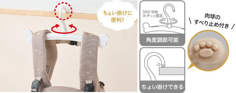 よだれや汗などの汚れが気になるから、頻繁に洗たくしたい抱っこひも。このハンガーなら干している間も型崩れしにくく、乾いたらいつもの置き場所へそのまま移動できます。