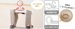 フックの向きは調節でき、好きな角度で固定できます。フックの先端は滑り止め付きだから、かもいなどにちょい掛けする時も落ちにくく便利。