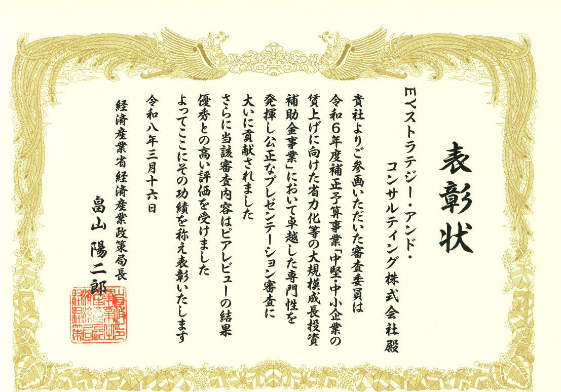 本事業は、地域の雇用を支える中堅・中小企業が、足元の人手不足等の課題に対応し、成長していくことを目指して行う大規模投資を促進することで、地方における持続的な賃上げを実現することを目的としています。EYSCは、多様な業界知識と事業成長計画策定に関する豊富な専門性を持つ有識者を審査員として起用し、申請事業者に対して補助金の効果的な活用方法や経営課題に関するアドバイスを各企業の特性に応じて提供してきました。この度、その支援活動が評価され、経済産業省から表彰状を授与されました。今回の受賞は令和5年度事業に引き続き2回目の受賞となります。