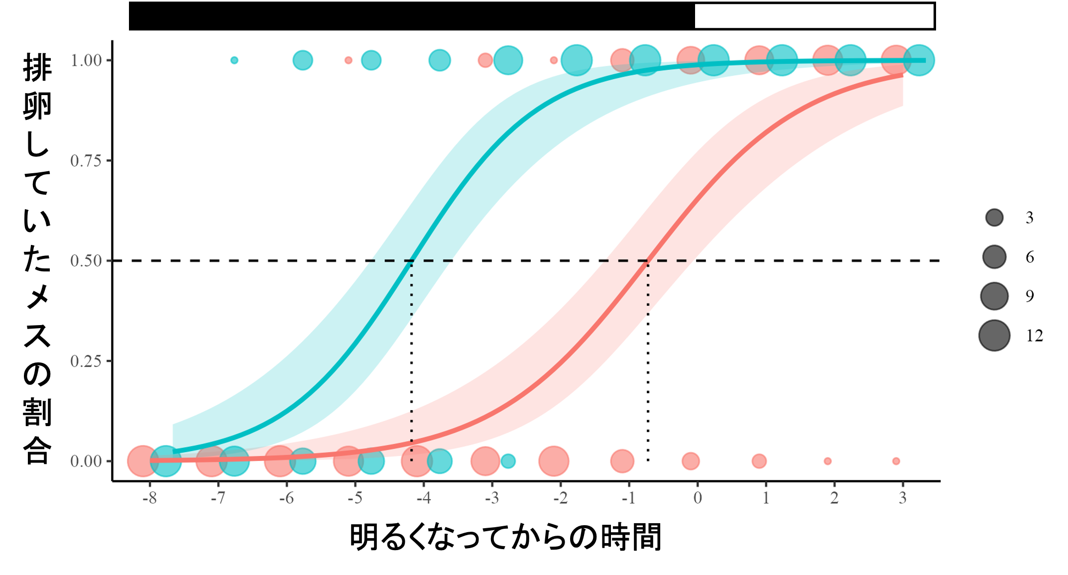 図3. 二つの飼育条件下(赤:実験室、青:野外に近い環境)における排卵していたメスの割合。野外条件では実験室条件と比較して排卵の開始がより早く、実験室条件では3.5時間の遅れが観察された。上部のバーは明期(白)と暗期(黒)を示す。〇の大きさは匹数を表す。