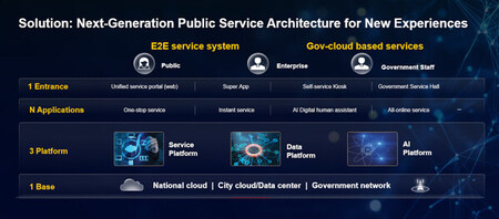 The solution provides a blueprint for how countries can modernise public service delivery using digital infrastructure, data platforms and AI-powered applications. At its core is an architecture built on the idea of "1 digital foundation + 1 intelligent platform + N industry applications", with the goal to create a service environment that is seamless, efficient and accessible across multiple channels.