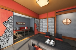新設する客室「イーストウイング 忍者ファミリールーム」は、「火の国」熊本をイメージした「赤」と、忍者をイメージした「黒・灰色」を基調とした落ち着いた雰囲気のモダンな和洋室でスタイリッシュなインテリアを設えながら、隠し部屋、忍者をイメージしたアートなど意匠が散りばめられたユニークなコンセプトルームとして登場いたします。お布団4組、ソファーベッド3台に加え、隠し部屋にもお布団を敷くことができ最大7名様まで宿泊可能です。親子三世代の家族旅行や、お子様を中心とした子連れ旅などお子様がワクワクしながらホテル滞在が楽しめる客室です。