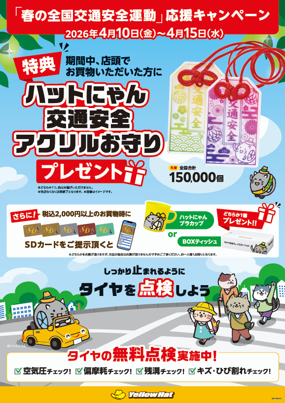 また、イエローハット全店舗において、お買い物いただいた方に「ハットにゃん 交通安全アクリルお守り」をプレゼントする店舗キャンペーンを2026年4月10日(金)から15日(水)まで実施いたします。