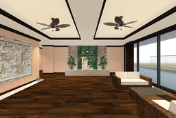エントランスホールは、深みのある木調フローリングと柔らかな照明が美しく調和し、室内に足を踏み入れた瞬間から、日常を離れた安らぎを感じられる空間です。正面には水が流れるオブジェを配置することで、空間全体に穏やかなリズムと潤いをもたらしました。さらに壁面には、異国情緒あふれるストーンカービングを施し、細部にまでこだわった意匠によって、居住者や来訪者を心地よく迎え入れるエントランスホールに仕上げています。
