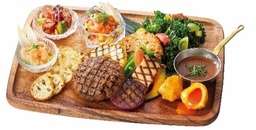 そこにバルサミコ風味の赤玉ねぎを添えることで爽やかな酸味が加わり、ハンバーグの旨味を引き立てます。付け合わせは、直火で焼いたエリンギ、ゴールデンパインとケールのサラダ。さらに、「ポケ トリオ」を同じプレートに盛り込み、コース仕立てのような満足感を表現しました。