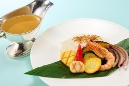 海老や帆立、ズッキーニにカボチャ、パイナップルを飾った彩り鮮やかなカレーは、パイナップルの甘みと酸味がアクセントです。