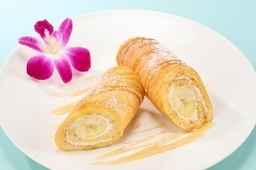厚さ3cmの専用の鉄板で焼いたパンケーキにバナナとリコッタチーズをのせ、ロール状に巻いた一品です。