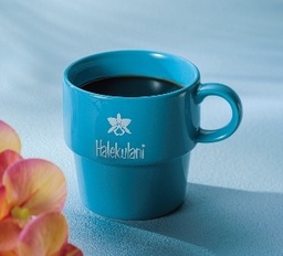 表面にハレクラニロゴマーク、裏面に帝国ホテルロゴマークをあしらった、鮮やかなハレクラニブルーのスタッキング可能なマグカップです。