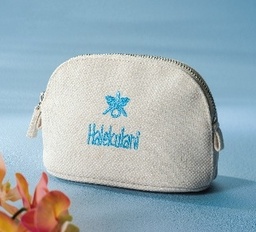 表面にハレクラニロゴマーク、裏面に帝国ホテルロゴマークをあしらった、オリジナルポーチです。リネンのような手触りでハワイらしさをイメージし、内側はハレクラニブルーの布地で仕立てました。