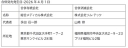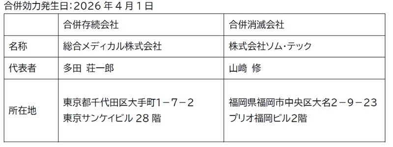 総合メディカルグループ株式会社の基幹事業を担う総合メディカル株式会社(本社:東京都千代田区、代表取締役社長:多田 荘一郎、以下「総合メディカル」)は、2026年4月1日付で、同社の100%子会社である株式会社ソム・テック(本社:福岡県福岡市、代表取締役社長:山﨑 修、以下「ソム・テック」)を吸収合併したことをお知らせします。