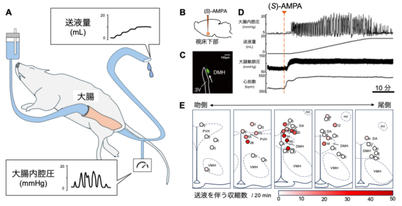 A:麻酔下のラットを用いて大腸運動を測定する実験。遠位結腸および肛門からカニューレを挿入し、生理食塩水で大腸内腔を満たした。大腸内腔圧と送液量を測定した。B:視床下部に対して (S )-AMPA 注入する実験。C:注入位置は蛍光の粒子(FluoSpheres)により確認された。D:視床下部に(S )-AMPAを注入すると、大腸内腔圧が変動し、内腔を満たす液が