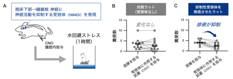 受容体に作用する試薬(CNO)をあらかじめ投与することで、心理的ストレス(水回避ストレス)による排便が変化するかどうかを検証した。B:対照ラットの排便は変化しなかった。C:神経を抑制したラットでは、排便が抑制された。