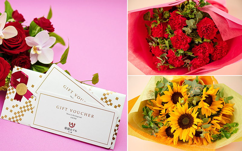帝国ホテル 大阪は、母の日・父の日向けの商品として、カーネーションまたはひまわりの花束をお部屋にご用意する宿泊プランを販売します。また、バリ式エステがセットになった宿泊プランや、乾杯用ドリンクやミニブーケなどがついたレストランプラン、エステとお食事がセットになったギフト券、レストランでご利用いただける昼食券・夕食券など、母の日・父の日にご活用いただけるさまざまな商品をご用意しています。