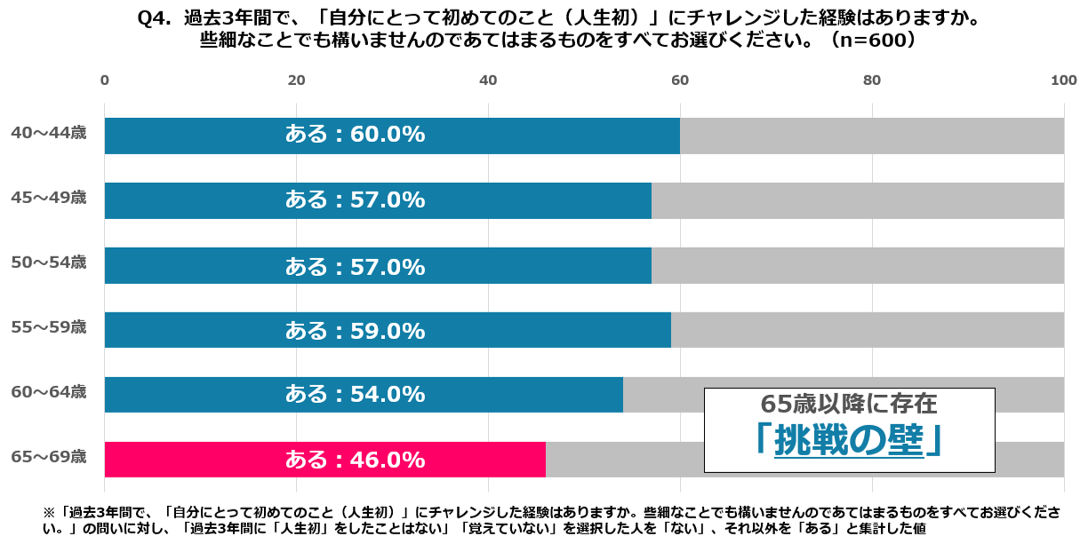 年代別に見ると、「人生初」への挑戦経験率は40代前半で60%と最も高く、50代でも57〜59%と高水準を維持しています。しかし、65歳以降になると46%まで低下、50代後半と比較して13ポイントもの差が生じており「挑戦の壁」が生じていることがわかりました。この急激な数値の落ち込みの背景には、先述の「体力・健康面の不安」(35.7%)や「年齢的にもう遅い」(15.2%)といった心理的・身体的ハードルが加齢によって大きく影響している可能性が示唆されました。