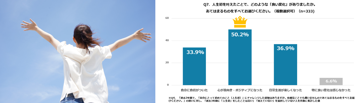 注目すべきは、挑戦がもたらす心身への好影響です。「人生初」に踏み出した人のうち、50.2%が「心が前向き・ポジティブになった」、36.9%が「日常生活が楽しくなった」と心身への影響を回答しています。
