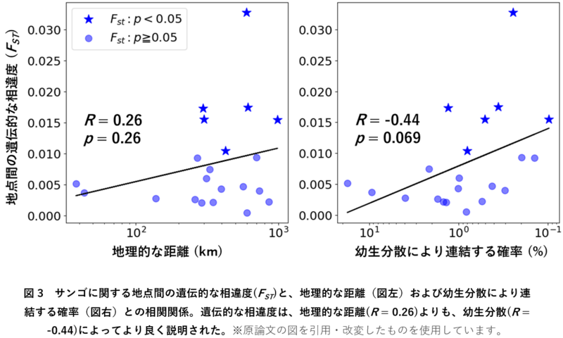 地点間のサンゴの遺伝的な相違度は、地理的な距離との相関が低く、幼生分散を通じた連結性とより強く相関していました(図3)。これは、ハワイやカリブ海などの他地域における先行研究で、島間の距離が離れるにつれてサンゴの遺伝的な相違度が高まると報告されていることと対照的でした。これらの結果は、連結性に基づく南西諸島のサンゴ礁生態系の保全を計画する上で、地理的関係だけでなく海流の影響も考慮することの重要性を強調しています。