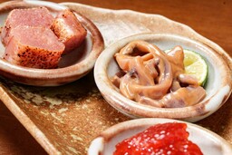 また、熱海市出身の代表・布施和広が手がける干物やつまみも、当店の大きな魅力のひとつです。布施は約20年にわたり、星付き店舗を含むさまざまな企業の食品製造やメニュー開発に加えて宣伝・PRに携わってきました。その経験を生かし、オリジナル干物、オリジナルからすみ、オリジナル塩辛などを、丁寧に、そして完成度高く仕上げています。実際に、つまみの約半分ほどを代表が製造しています。