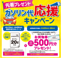 ・原油高、物価高対策 として、合計20L以上のガソリン給油レシートをお持ちいただくと、2,000円(税込)以上のお買い上げで1枚ご利用いただけるお買物券500円分を先着で進呈します。