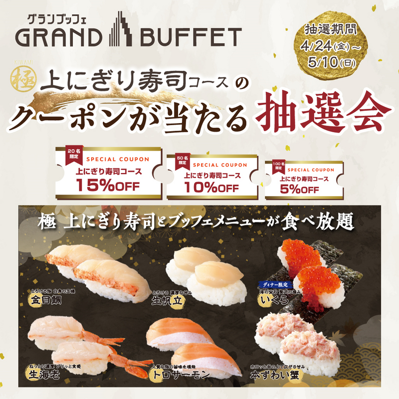 ・【期間限定】上にぎり寿司食べ放題 コースのクーポンが当たる抽選会を実施。