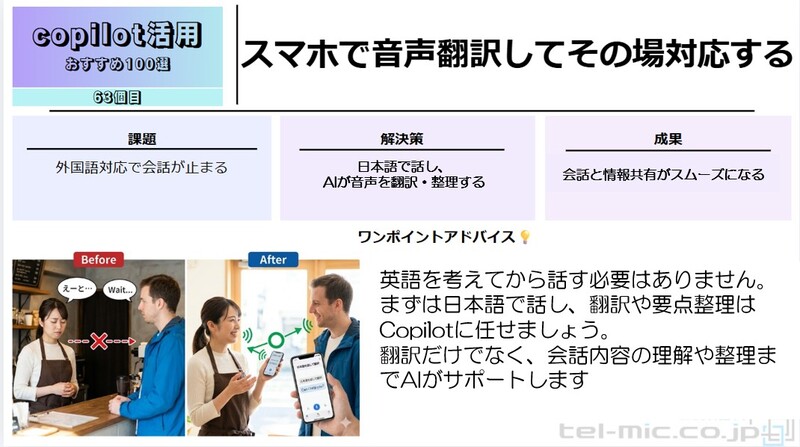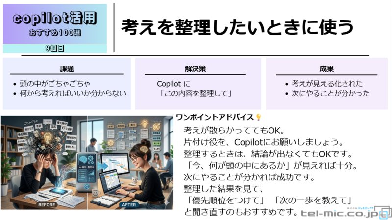 「Copilotをどう使ったら良いかわからない」という社員のために、テルミックでは、社内向けに独自のマニュアルを作成し、活用の具体例を紹介することにしました。「Copilot活用100本ノック」と題したこのマニュアルには、「AIの言葉を鵜呑みにしない」「個人情報を入力しない」といった注意点も明記。メール文面や報告書の作成など基本的な活用例から、テルミック独自の業務に即した活用事例まで取り上げています。まずは50本をリリースし、残りの50本には若手を中心とする社員の意見や活用実例を取り入れていく予定です。