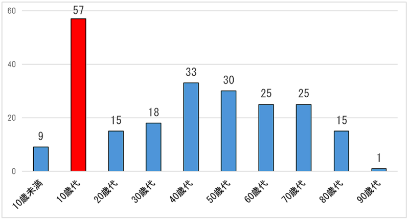 自転車の事故 299 件のうち、被害者の年代が判明したものについて、年代別の事故発生件数を図 2 に示します。自転車の事故では 10 歳代の事故が最も多くなっています。