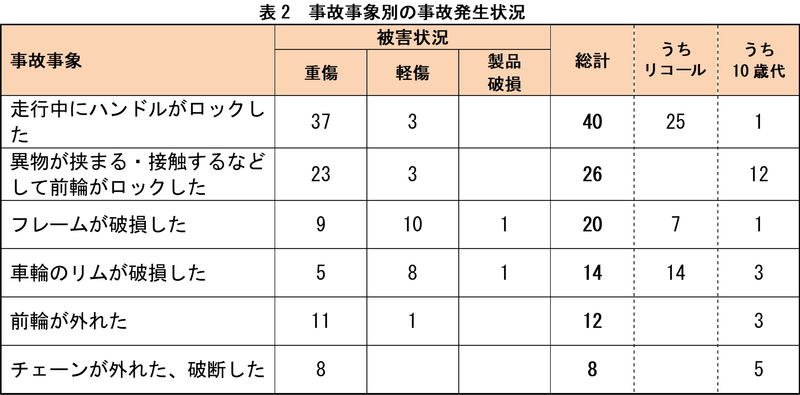 自転車の事故 299 件のうち、事故発生時の状況が判明したものについて、件数の多い主な事故事象を表 2 に示します。