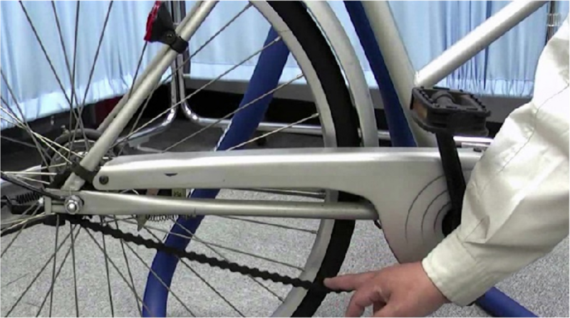 自転車のチェーンは、走行するにつれ徐々に伸びて、たるみが発生します。走行中にチェーンから異音(金属がこすれるような音など)がする場合は、たるんだチェーンがチェーンケースなどに接触しているおそれがあります。また、チェーンがさびている場合は、劣化が進行したり、脆くなってチェーンが切れたりする可能性があります。チェーンが伸びた場合やさびがひどい場合は、自転車の販売店などに相談してください。