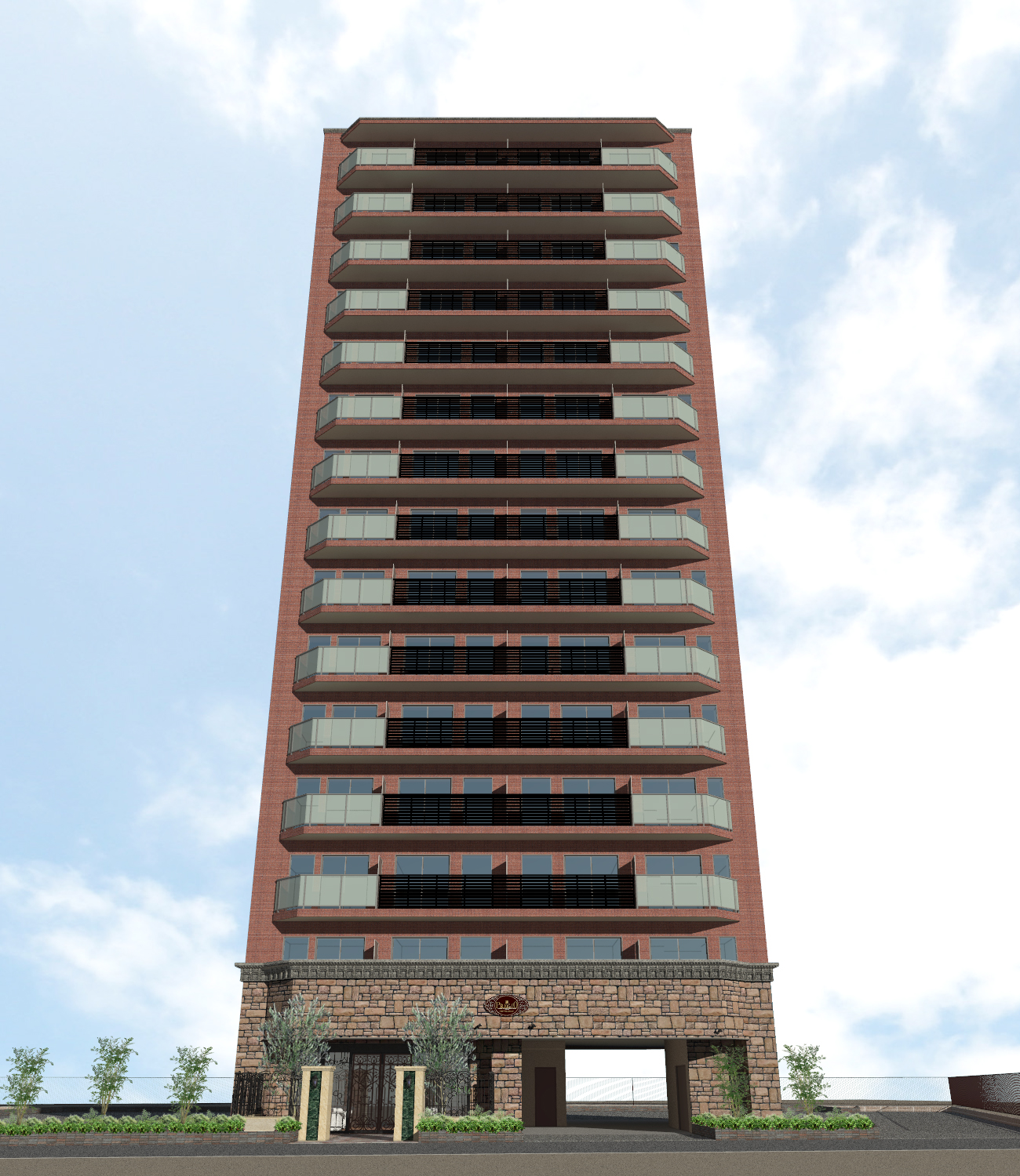 建物外観は、格調高い「ヨーロピアン」スタイルを採用しております。赤茶色のレンガ調タイルを基調とした上質な色調で仕上げ、基壇部には重厚な印象を与える石積みのテクスチャを施しました。洗練されたシルエットが街並みに調和しながらも、圧倒的な存在感と異国情緒豊かな高級感を演出しています。