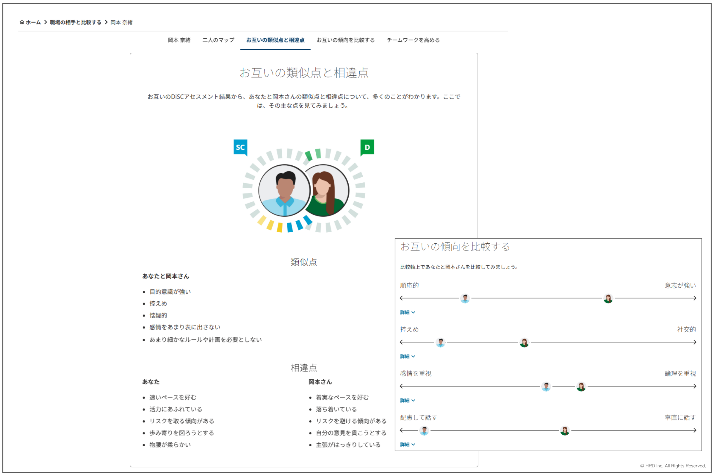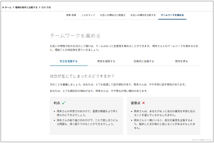 自分と相手の違いや共通点を8つの尺度で可視化し、どのように伝えればよいか、どこで認識のズレが起きやすいかを関係ごとに提示します。ユーザーはそのデータをもとに、お互いが大切にしていること やモチベーションの源泉、ストレス要因などを踏まえた、具体的な関わり方のガイドを得ることができます。