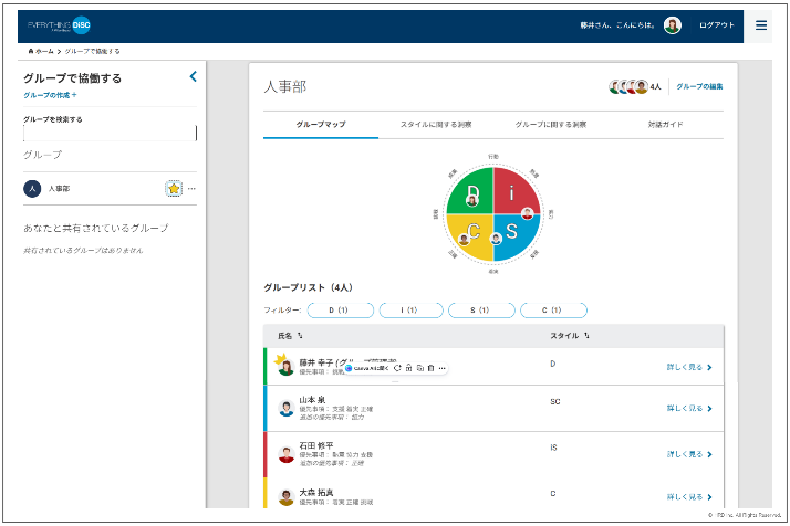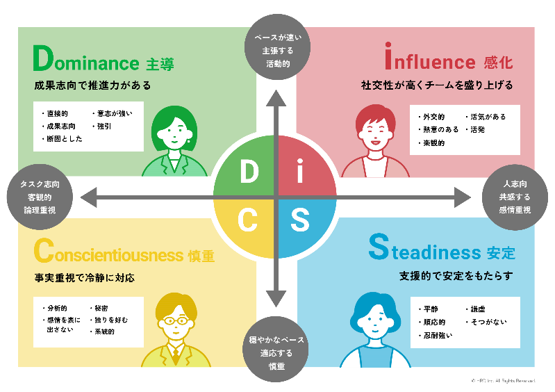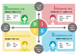 DiSC®は、Dominance(主導)・influence(感化)・Steadiness(安定)・Conscientiousness(慎重)の4つの特性から人の行動傾向を捉える、パーソナリティ心理学に基づいたグローバルスタンダードの人材アセスメントです。