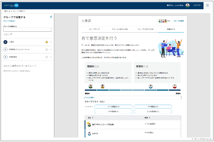 チーム全体の特性を可視化し、メンバー間の関係性やコミュニケーションの傾向を俯瞰して把握できます。対話ガイドを通じて意思決定や協働の進め方を整理し、チームの共通認識やルールづくりに活かすことができます。新規部署の立ち上げや部門横断プロジェクトなど、多様なメンバーが関わる場面での連携強化やマネジメントにも有効です。