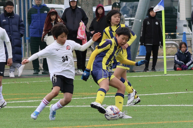 SSS札幌サッカースクール(黄青ユニフォーム)とASC北海道(白ユニフォーム)