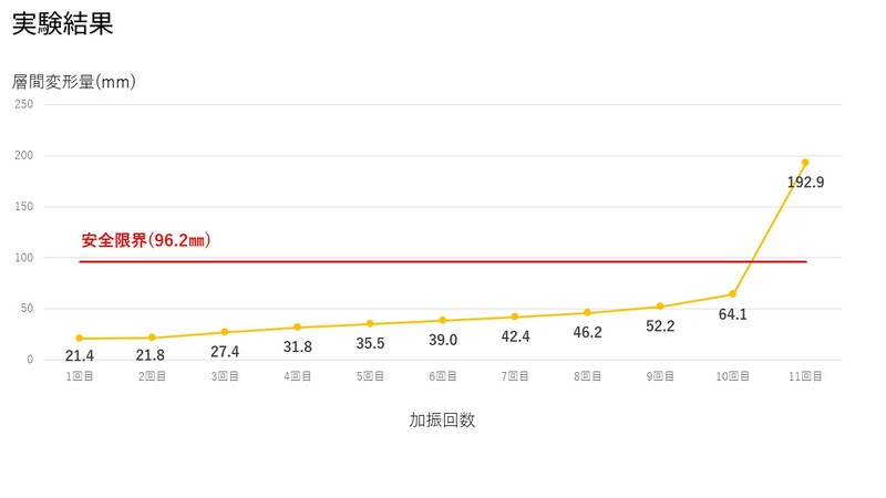 その結果、震度7相当の揺れを10回加えても安全限界まで達しないことを確認しました。