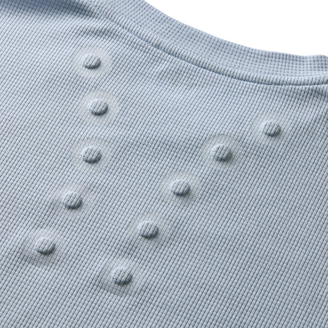 軽量で優しい肌触りをそのままに、さらりとドライな快適性を大幅アップ。肌に触れる面は優しい風合いの綿、表面はドライ感のあるポリエステルのワッフル構造サーマルニット生地を採用。凹凸組織で肌離れ抜群で汗をかいてもベタつきません。綿が汗を吸収し、ポリエステルが素早く排出するので一日中サラサラです。程よいハリ感と通気性で体にまとわりつかず、空気の層を保ちながら快適に着用可能。肩線の縫い位置を前身頃に移動、袖周りにゆとりをもたせ、よりストレスフリーで寝返りしやすくなりました。カラーはスモーキーブルーとチャコールの2色、ユニセックス仕様で豊富な4サイズ展開です。肩から背中に沿って130ミリテスラの磁石を10個N極S極交互配列で配置した睡眠用シャツ。着て寝るだけで広範囲に磁力が影響し、肩・背中部分の血行を促進、コリを緩和し朝まで快適な睡眠をサポートします。