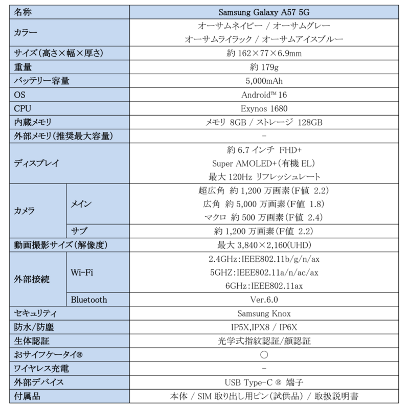 <主な仕様:「Samsung Galaxy A57 5G」>