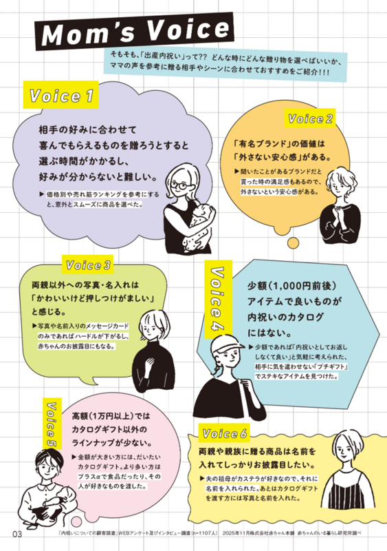 このカタログは、これからお祝いのお返しをするママ・パパ、出産を控えたご家族のために作った出産内祝いカタログです。ママ・パパのリアルな悩みに寄り添い、実用的なカタログとなるよう、社内の調査・研究機関である「赤ちゃんのいる暮らし研究所」と連携して子育て中のママ・パパへのインタビュー調査(※)を実施し、先輩ママ・パパのアドバイスなどを掲載しています。
