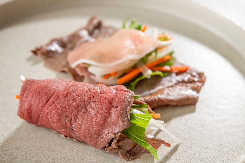 オーストラリア和牛の焼きしゃぶに生ハムを合わせた、サルティンボッカ風の一皿です。