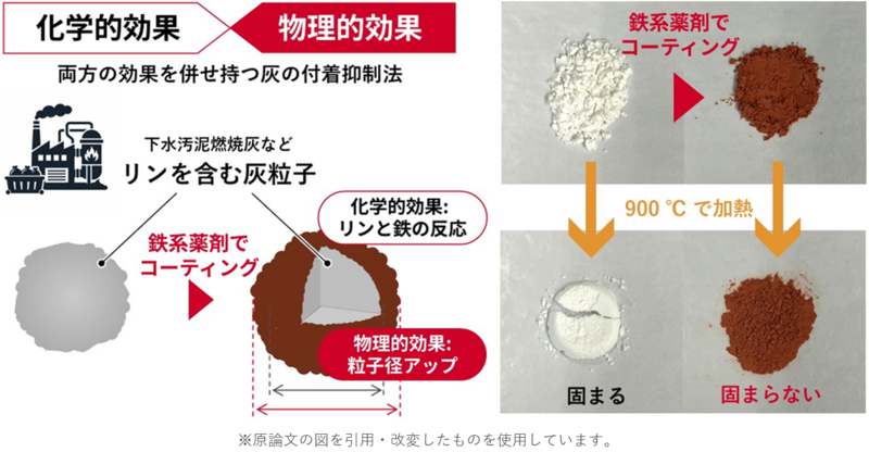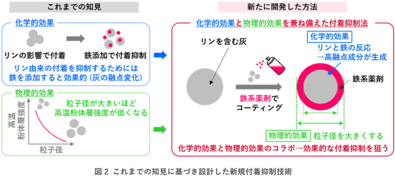 今回、リンが原因となる灰の付着を抑えるために化学的な観点から、薬剤成分として強い効果が期待される鉄系化合物を選定しました。リンと鉄の反応によって、融点の高い成分が生成して灰が融けにくくなります。物理的な観点から、薬剤成分で灰粒子をコーティングし、見かけの粒子サイズを大きくすることを考えました。鉄系薬剤で灰粒子をコーティングすることで、リンと鉄の反応による化学的な付着抑制効果と、粒子径増加による物理的効果の相乗効果により、優れた付着抑制効果が発現すると考えました(図2)。