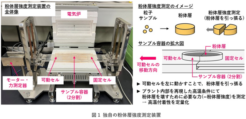 本研究は、高温(500~900℃)条件で灰粒子の付着を抑えることを目的としています。付着抑制効果を判定するためには、粒子の付着性を高温条件で評価することが必要不可欠ですが、定量的な評価手法はほとんどありません。研究グループは、高温条件で粒子の付着性を定量化できる独自の粉体層強度測定装置を有しています(図1)。この装置では、粒子をサンプル容器に詰めてその集合体(粉体層)の引張強度を測定することで、付着性を定量化しています。測定セルなどの工夫により高温(最高1000℃)条件で強度測定を行うことができるため、高温付着性を定量化できます。