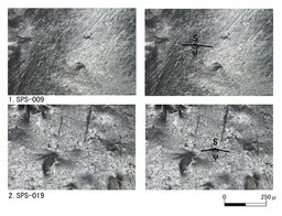 また、実験試料との対比から、押圧剥離法によって小形石刃が剥離される途上で、平滑な面を作り出すために、硬い石を利用した砥石によって石核の複数の面が磨かれていたことが推定できました。このような行為の痕跡が把握されることは大変珍しく、黒曜石を利用した石器作りの比較研究を進めていくうえで、類例の確認が期待されます。