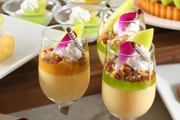芳醇な香りのメロンジュレに、なめらかなプリンを贅沢に重ねて。サクサクとしたクランチの香ばしさがアクセントを添える、爽やかなグラスパフェ。