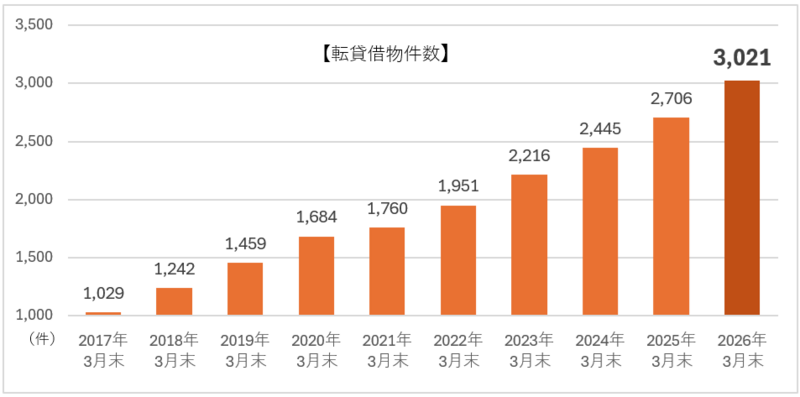 家賃収入を積み上げるストック型のビジネスモデルにより成長を続け、当社グループの取り扱う転貸借物件の数は3,021件(2026年3月末時点)と、代表的な飲食チェーン店の国内店舗数(1,000~3,000件規模)を上回る水準となりました。