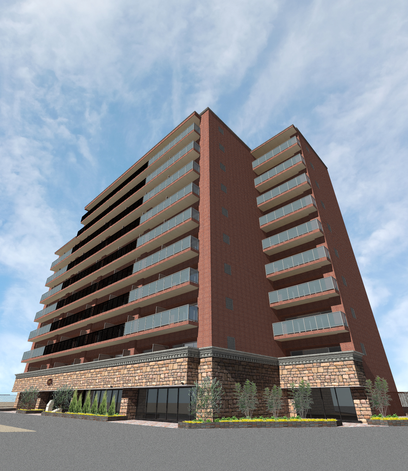 温かみのある赤茶色のレンガ調タイルを全面に施し、落ち着きと重厚感を兼ね備えた上質な佇まいを創出しています。低層部には石積みのテクスチャを取り入れ、外観に奥行きと落ち着きをもたらしています。上層部へと伸びるシャープなシルエットと、均整の取れたバルコニーが、洗練された都市的な表情を形成しています。