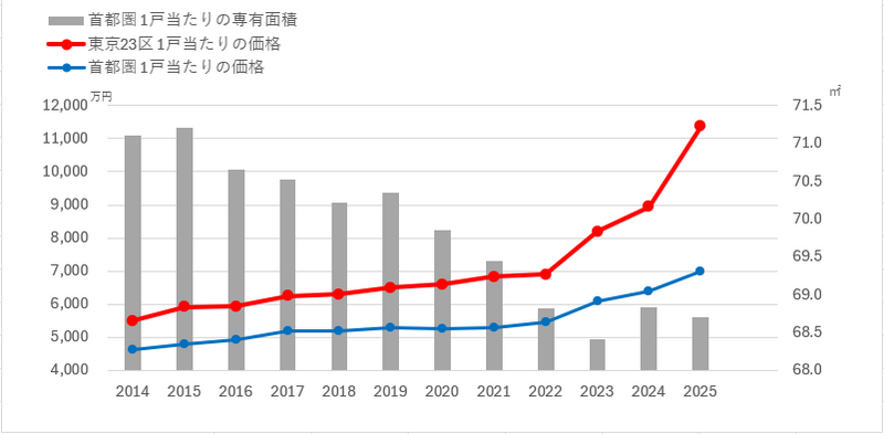 首都圏を中心に住宅価格は上昇を続けており、それに伴い住戸の専有面積は縮小傾向にあります。