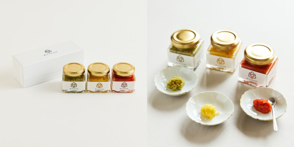 1918年創業のMIFUKUANが伝統の「漬ける」技術を応用した、料理を引き立てる「なま柚子こしょう」のセットです。熟す前の柚子の皮と青唐辛子を合わせた「青」はお刺身や焼き鳥のわさび代わりに。完熟柚子と赤唐辛子の「赤」は温かいお料理の旨味を一層引き立てます。完熟柚子と黄色唐辛子を使用した「黄」 は、柚子の華やかな香りが特徴で、温野菜や湯豆腐にぴったりです。 自然農法で種から育てられた佐賀県産の希少な実生柚子※と、農薬不使用で育てられた唐辛子を使用し、瑞々しい香りと爽やかな味わいを活かして仕上げた贈り物などにおすすめの逸品です。