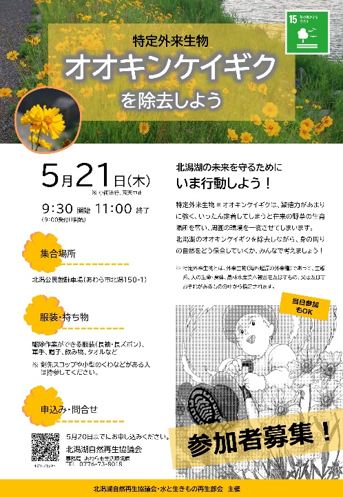 この取り組みをさらに前進させるため、北潟湖自然再生協議会(事務局:あわら市生活環境課)は、令和8年5月21日(木)に市民参加型の除去イベントを開催します。