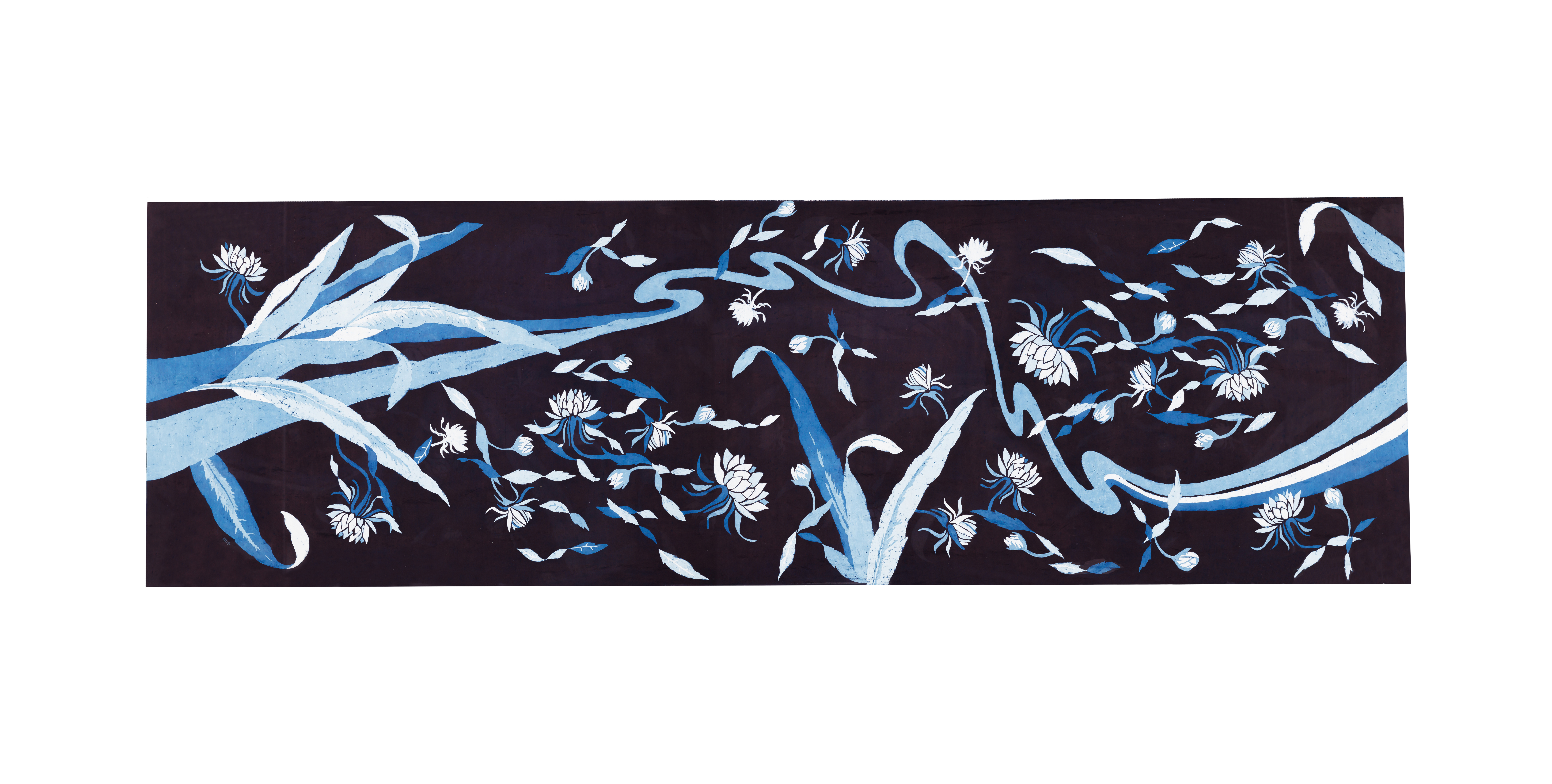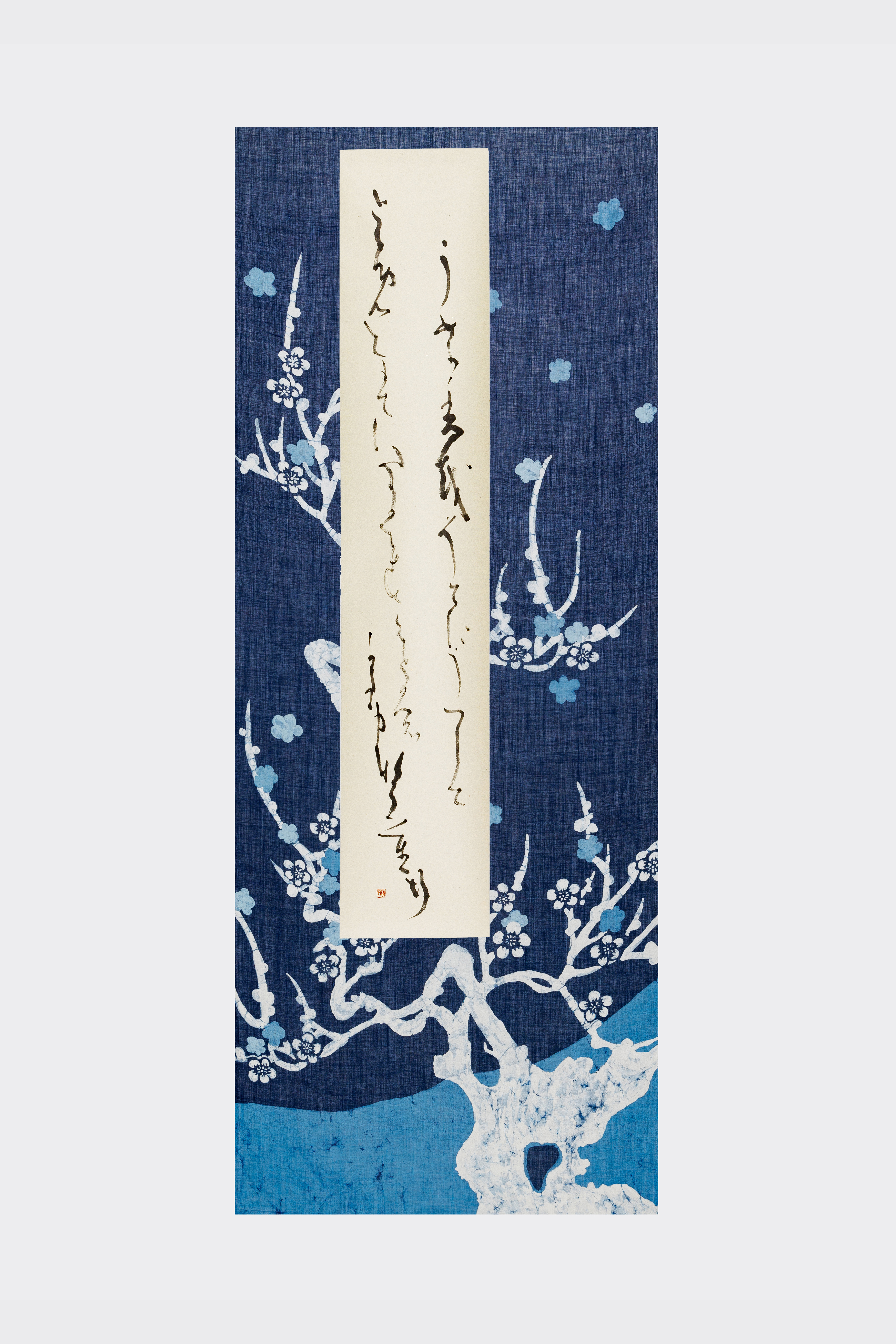 「徳島で向き合ってきた藍の表現を、ヴェネツィアという歴史ある舞台でご覧いただけることを大変うれしく思います。和歌の世界を立体的に感じられる表現を目指しています。仮名書道の流れは、香りという目に見えない感覚を写し取るように空間に漂わせ、藍染めのテキスタイルでは枝や花の気配を広がりとして描いています。書と染めを一体として扱うことで、新しい立体化を目指しております。」