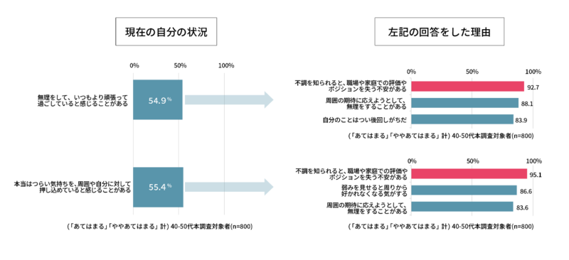 現在の自身の状況について、半数以上の女性は「無理をして、いつもより頑張って過ごしていると感じることがある」(54.9%)、「本当はつらい気持ちを、周囲や自分に対して押し込めてい ると感じることがある」(55.4%)、と回答しました。 その理由の第一位に共通して挙げられた回答は、「不調を知られると、仕事や家庭での評価やポジションを失う不安がある」(「無理をして、いつもより頑張って過ごしていると感じることがある」:92.7%、「本当はつらい気持ちを、周囲や自分に対して押し込めていると感じることがある」95.1%)となっており、90% 以上の女性が仕事や家庭に不調を知られることへの影響を不安視していることが明らかになりました。