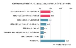 さらに、自身の不調を周囲に相談することについても、何らかのハードルを感じていることが明らかになりました。「大げさだと思われそうで話しづらい」(20.0%)や「理解してもらえないのではないか」(19.6%)といった、周囲の目を気にする不安が上位を占めています。 周囲を優先し、自身の不調 を「我慢」で乗り切ろうとしている実態が浮き彫りとなっています。